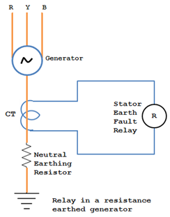 Faltas fase-terra geralmente ocorrem nas ranhuras da armadura. A corrente de falta à terra é geralmente limitada pela resistência no fio neutro do gerador. Um relé sensível de proteção contra falta à terra, conforme mostrado na figura, é usado para proteger o enrolamento do estator contra tais falhas.